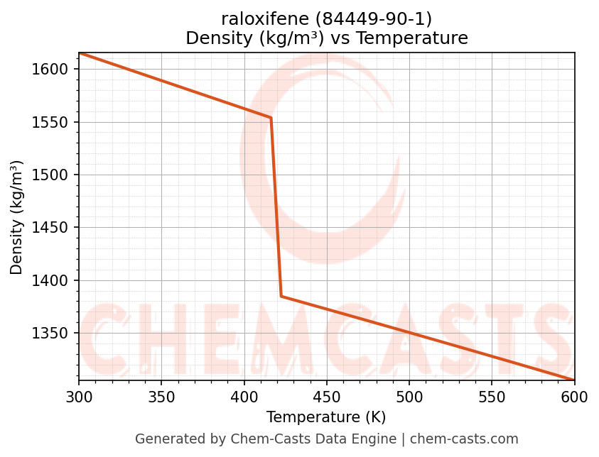 This page presents the temperature-dependent thermodynamic and transport properties of raloxifene (CAS 84449-90-1) calculated at a constant pressure of 1 atm (101325 Pa) over the temperature range 250-500 K.