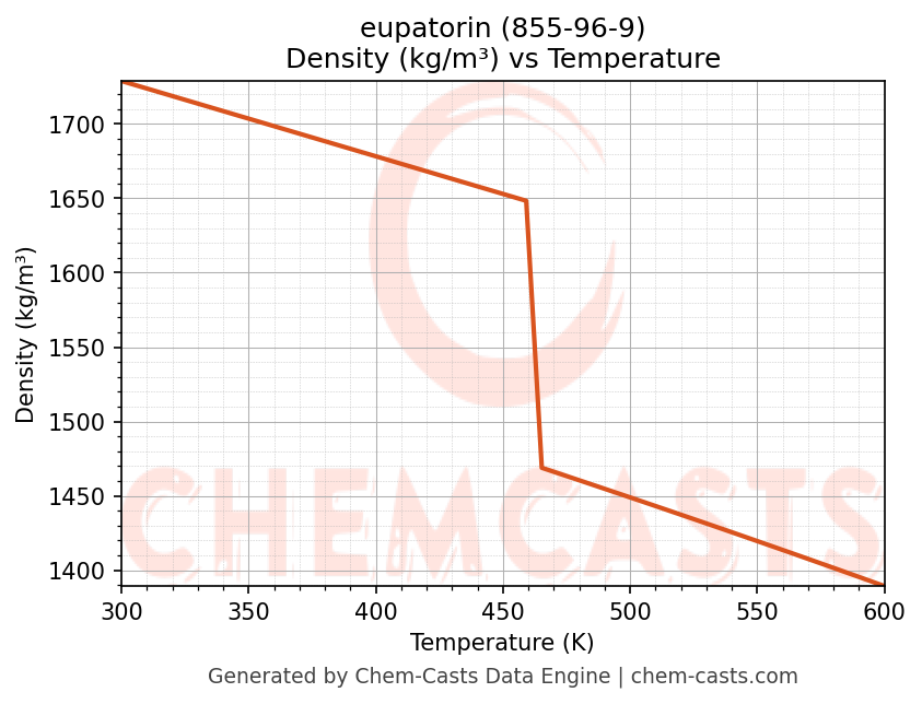 This page presents the temperature-dependent thermodynamic and transport properties of eupatorin (CAS 855-96-9) calculated at a constant pressure of 1 atm (101325 Pa) over the temperature range 250-500 K.