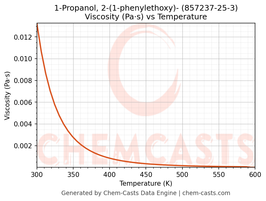 This page presents the temperature-dependent thermodynamic and transport properties of 1-Propanol, 2-(1-phenylethoxy)- (CAS 857237-25-3) calculated at a constant pressure of 1 atm (101325 Pa) over the temperature range 250-500 K.