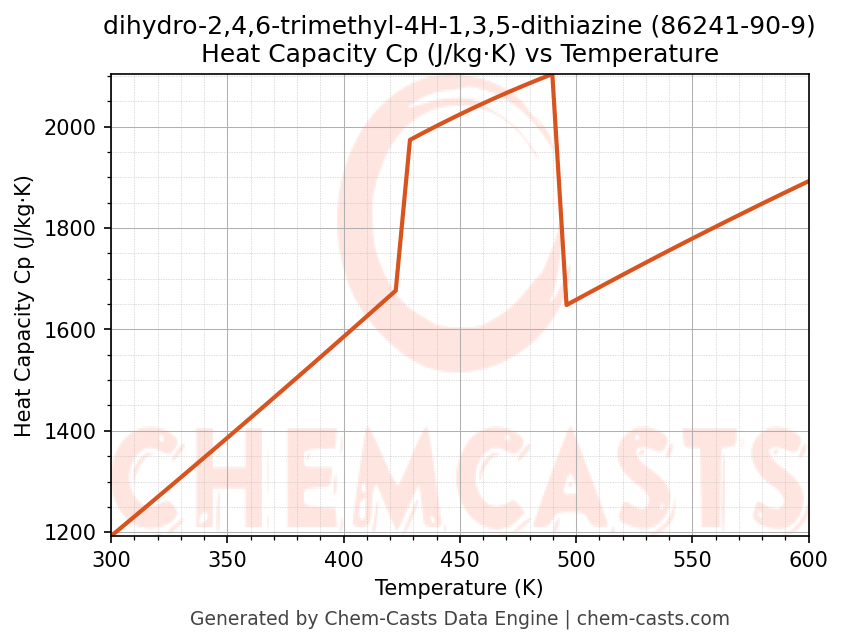 - Specific heat capacity (Cp) indicates the amount of energy required to raise the temperature of dihydro-2,4,6-trimethyl-4H-1,3,5-dithiazine and is critical for energy balance and heat-exchanger design.