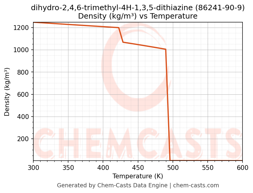 This page presents the temperature-dependent thermodynamic and transport properties of dihydro-2,4,6-trimethyl-4H-1,3,5-dithiazine (CAS 86241-90-9) calculated at a constant pressure of 1 atm (101325 Pa) over the temperature range 250-500 K.