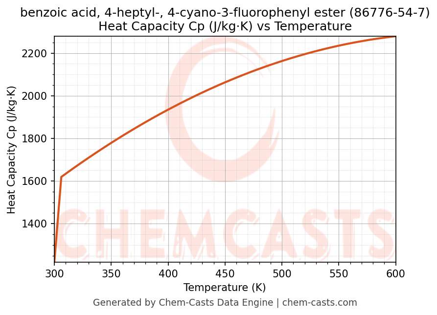 - Specific heat capacity (Cp) indicates the amount of energy required to raise the temperature of benzoic acid, 4-heptyl-, 4-cyano-3-fluorophenyl ester and is critical for energy balance and heat-exchanger design.