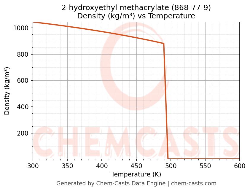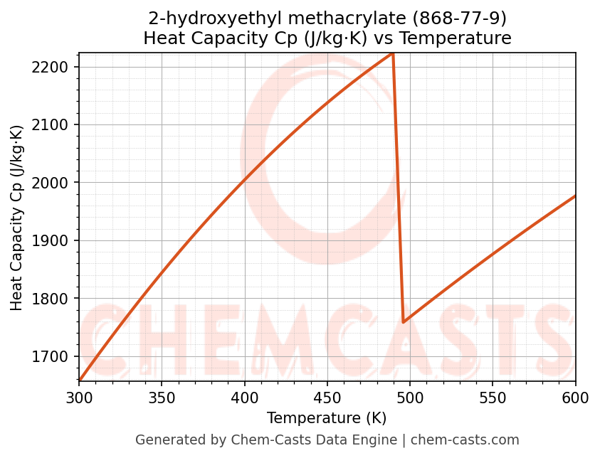 - Specific heat capacity (Cp) indicates the amount of energy required to raise the temperature of 2-hydroxyethyl methacrylate and is critical for energy balance and heat-exchanger design.