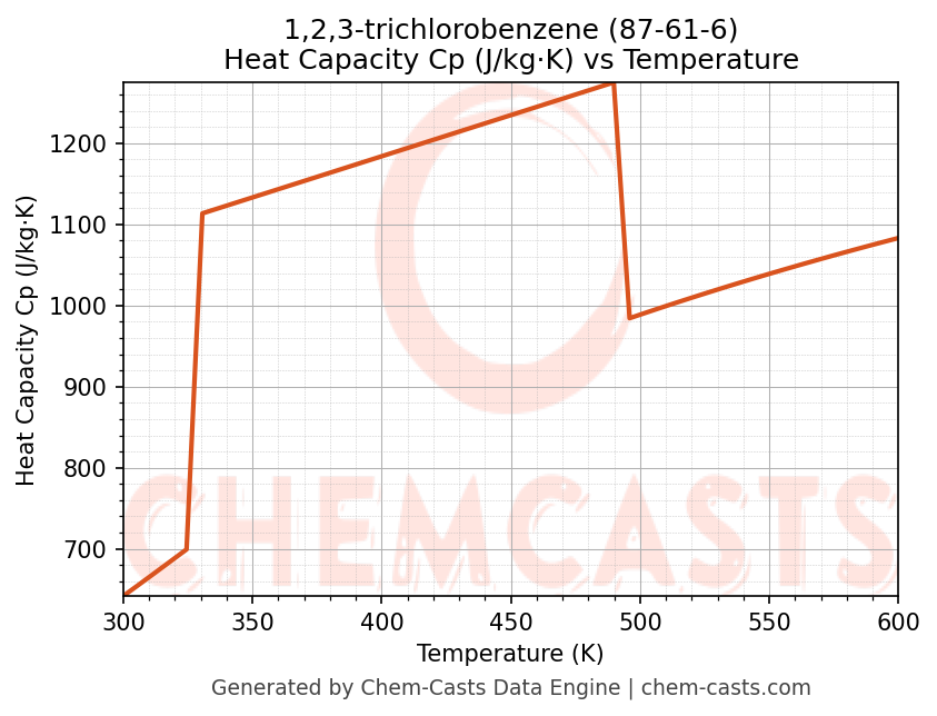 - Specific heat capacity (Cp) indicates the amount of energy required to raise the temperature of 1,2,3-trichlorobenzene and is critical for energy balance and heat-exchanger design.