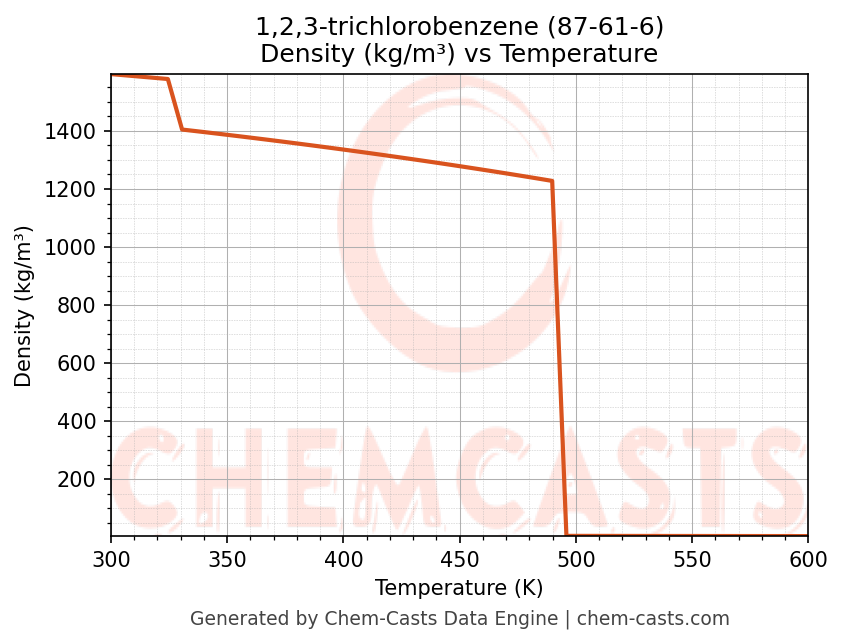 This page presents the temperature-dependent thermodynamic and transport properties of 1,2,3-trichlorobenzene (CAS 87-61-6) calculated at a constant pressure of 1 atm (101325 Pa) over the temperature range 250-500 K.