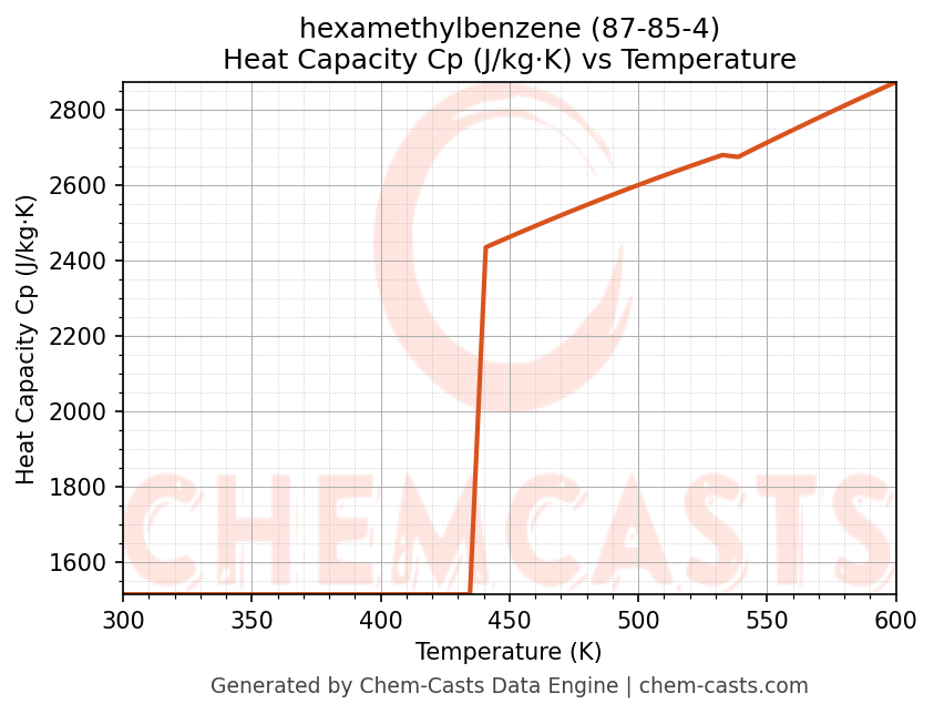 - Specific heat capacity (Cp) indicates the amount of energy required to raise the temperature of hexamethylbenzene and is critical for energy balance and heat-exchanger design.