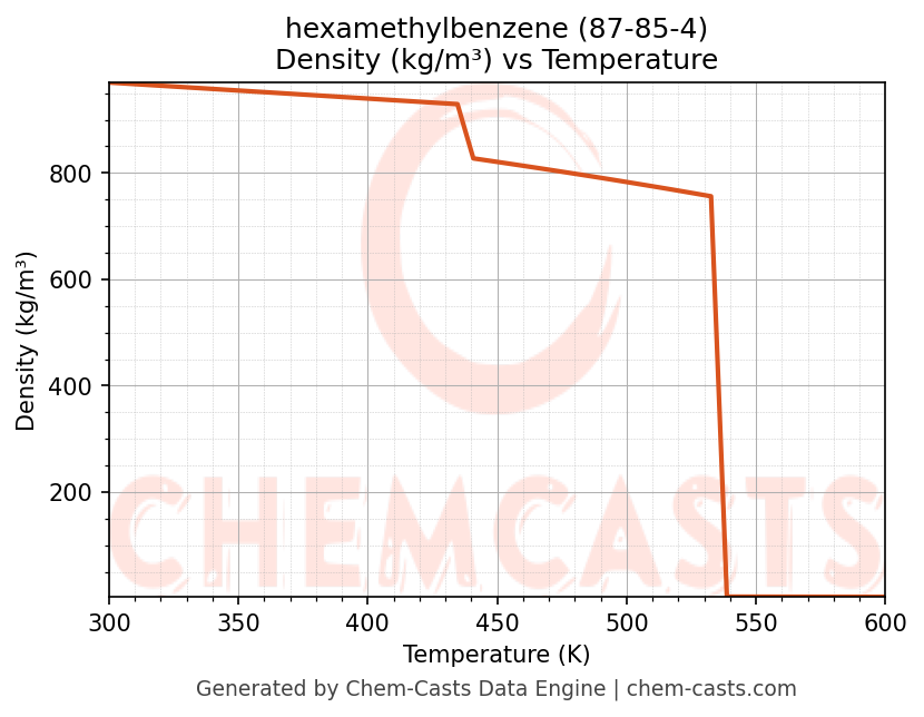 This page presents the temperature-dependent thermodynamic and transport properties of hexamethylbenzene (CAS 87-85-4) calculated at a constant pressure of 1 atm (101325 Pa) over the temperature range 250-500 K.