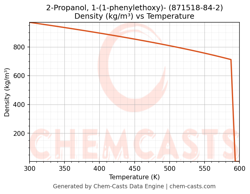 This page presents the temperature-dependent thermodynamic and transport properties of 2-Propanol, 1-(1-phenylethoxy)- (CAS 871518-84-2) calculated at a constant pressure of 1 atm (101325 Pa) over the temperature range 250-500 K.