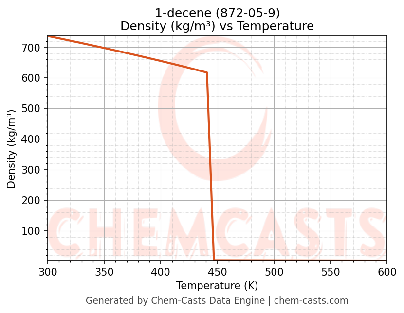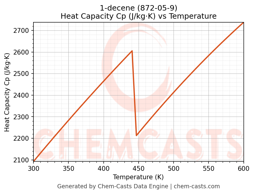- Specific heat capacity (Cp) indicates the amount of energy required to raise the temperature of 1-decene and is critical for energy balance and heat-exchanger design.