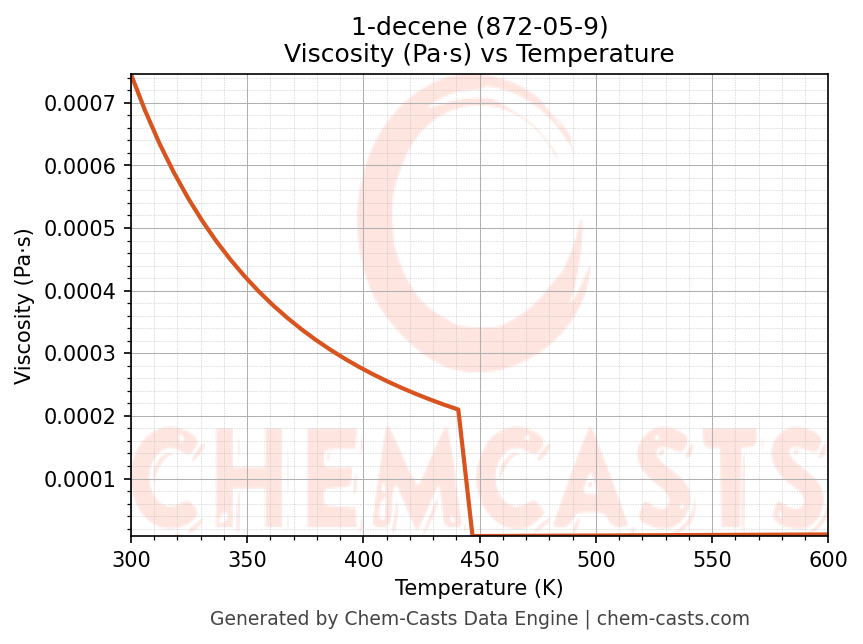 This page presents the temperature-dependent thermodynamic and transport properties of 1-decene (CAS 872-05-9) calculated at a constant pressure of 1 atm (101325 Pa) over the temperature range 250-500 K.