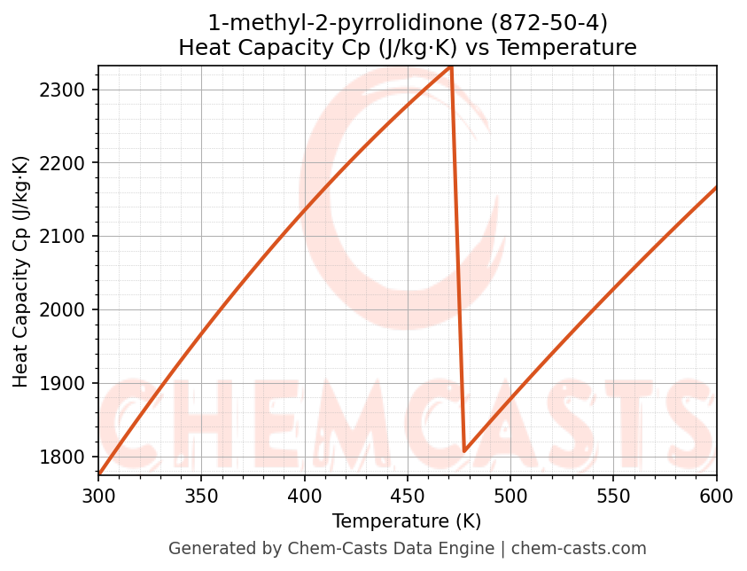 - Specific heat capacity (Cp) indicates the amount of energy required to raise the temperature of 1-methyl-2-pyrrolidinone and is critical for energy balance and heat-exchanger design.