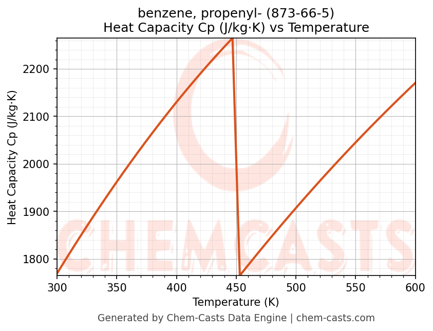 - Specific heat capacity (Cp) indicates the amount of energy required to raise the temperature of benzene, propenyl- and is critical for energy balance and heat-exchanger design.