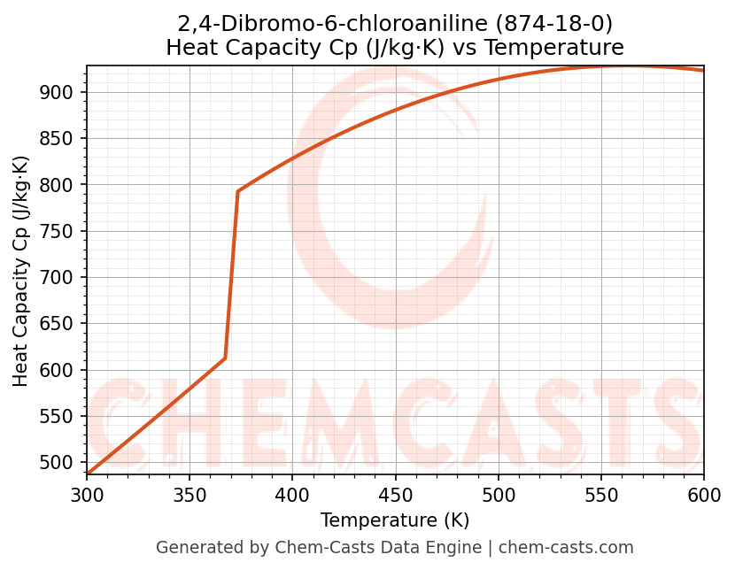 This page presents the temperature-dependent thermodynamic and transport properties of 2,4-Dibromo-6-chloroaniline (CAS 874-18-0) calculated at a constant pressure of 1 atm (101325 Pa) over the temperature range 250-500 K.