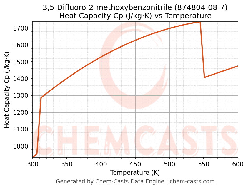 - Specific heat capacity (Cp) indicates the amount of energy required to raise the temperature of 3,5-Difluoro-2-methoxybenzonitrile and is critical for energy balance and heat-exchanger design.