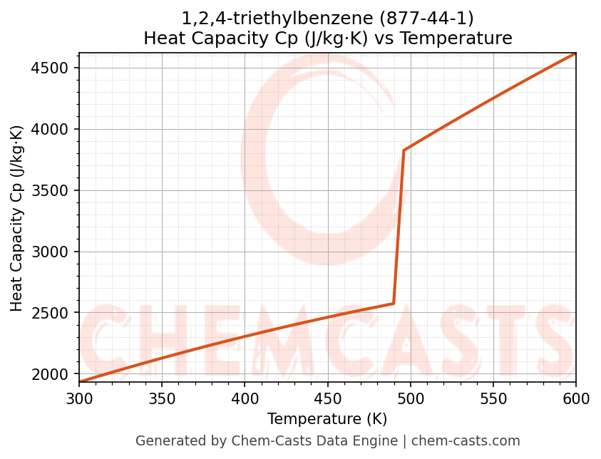 - Specific heat capacity (Cp) indicates the amount of energy required to raise the temperature of 1,2,4-triethylbenzene and is critical for energy balance and heat-exchanger design.