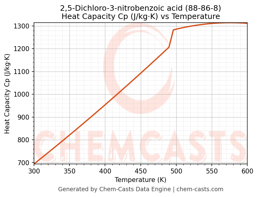 - Specific heat capacity (Cp) indicates the amount of energy required to raise the temperature of 2,5-Dichloro-3-nitrobenzoic acid and is critical for energy balance and heat-exchanger design.