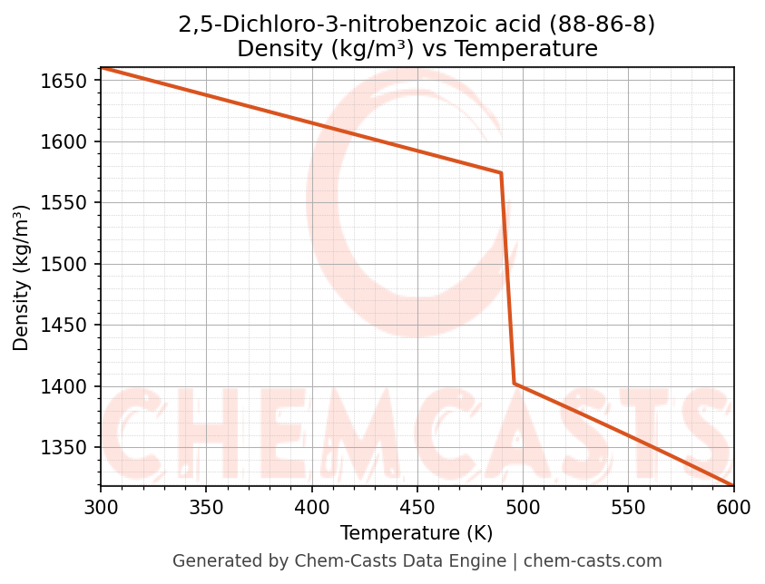This page presents the temperature-dependent thermodynamic and transport properties of 2,5-Dichloro-3-nitrobenzoic acid (CAS 88-86-8) calculated at a constant pressure of 1 atm (101325 Pa) over the temperature range 250-500 K.
