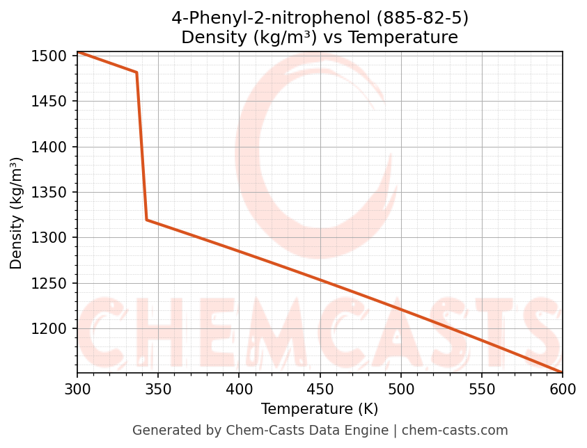 This page presents the temperature-dependent thermodynamic and transport properties of 4-Phenyl-2-nitrophenol (CAS 885-82-5) calculated at a constant pressure of 1 atm (101325 Pa) over the temperature range 250-500 K.