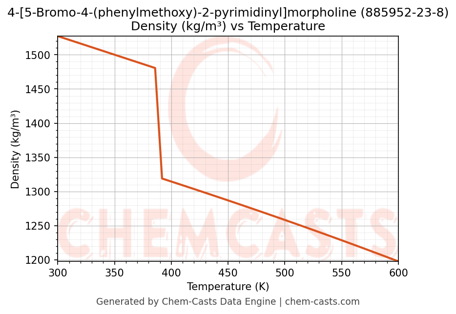 ![Density vs Temperature chart for 4-[5-Bromo-4-(phenylmethoxy)-2-pyrimidinyl]morpholine (CAS 885952-23-8)](https://chemcasts-prod.s3.ap-south-1.amazonaws.com/chem_plots_pconst/885952-23-8-density.png)