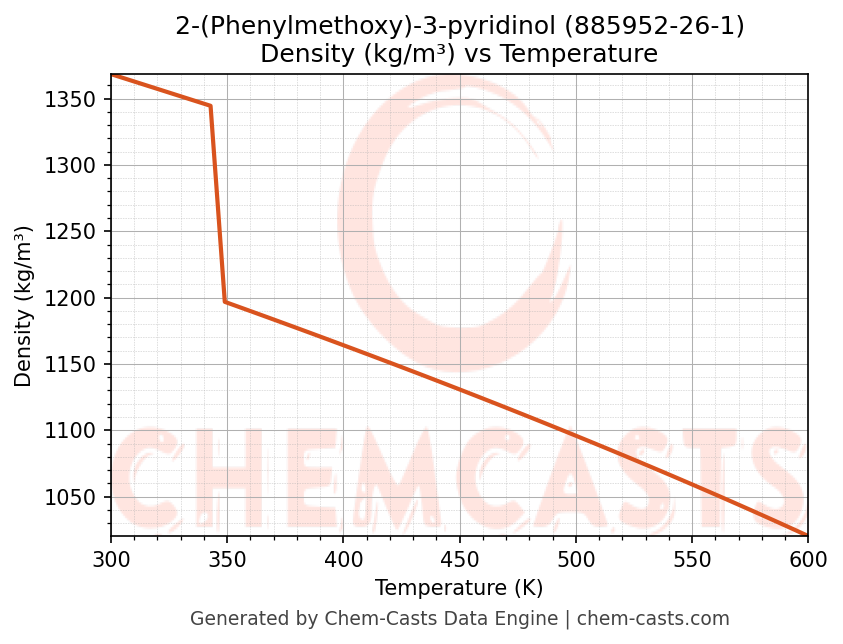 This page presents the temperature-dependent thermodynamic and transport properties of 2-(Phenylmethoxy)-3-pyridinol (CAS 885952-26-1) calculated at a constant pressure of 1 atm (101325 Pa) over the temperature range 250-500 K.