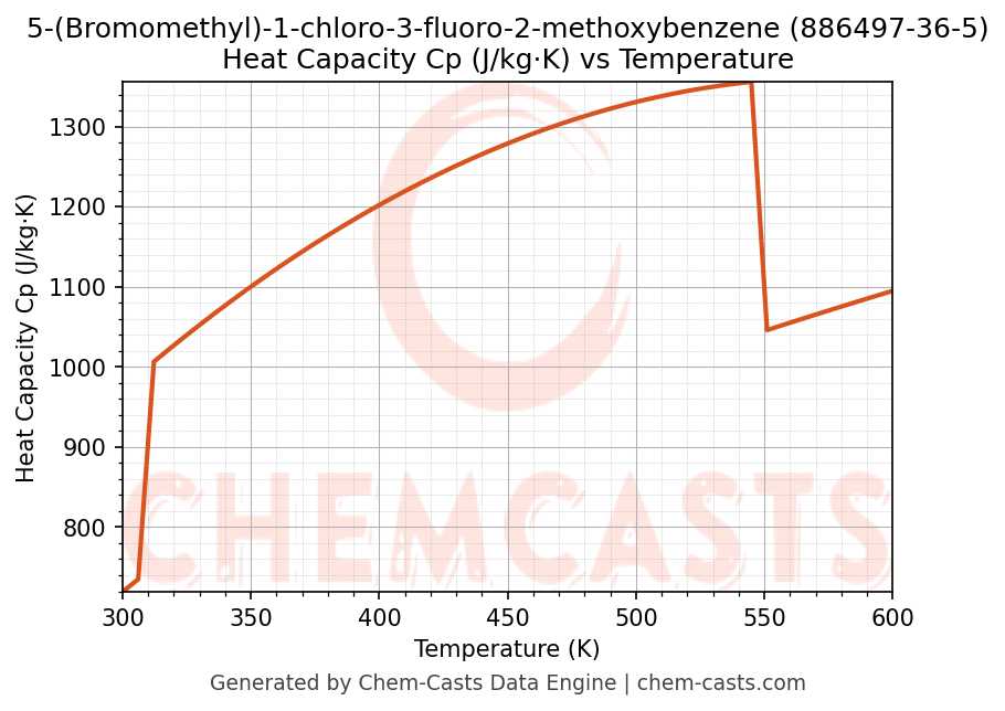 - Specific heat capacity (Cp) indicates the amount of energy required to raise the temperature of 5-(Bromomethyl)-1-chloro-3-fluoro-2-methoxybenzene and is critical for energy balance and heat-exchanger design.
