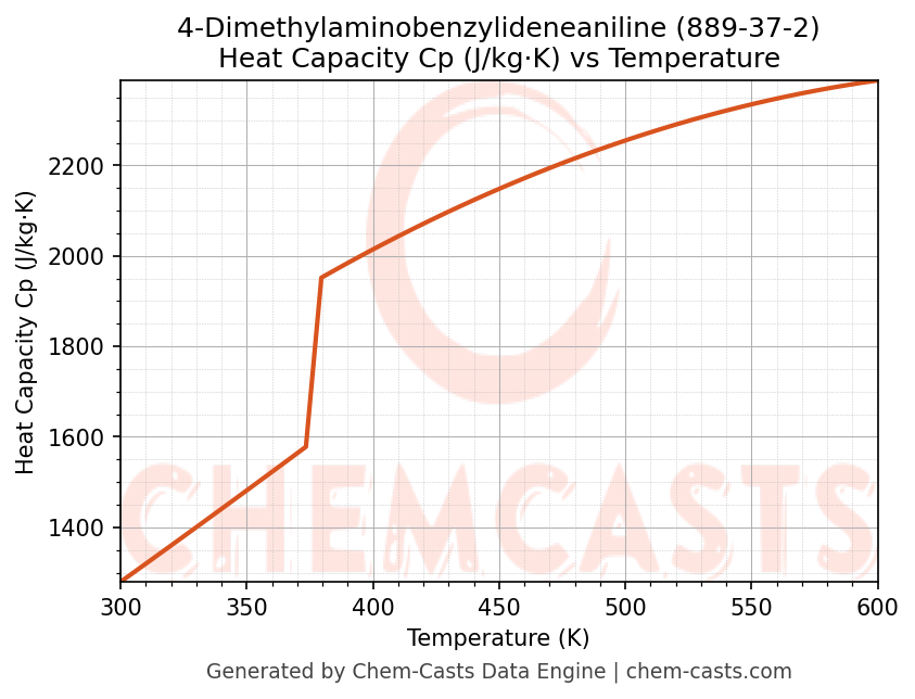- Specific heat capacity (Cp) indicates the amount of energy required to raise the temperature of 4-Dimethylaminobenzylideneaniline and is critical for energy balance and heat-exchanger design.
