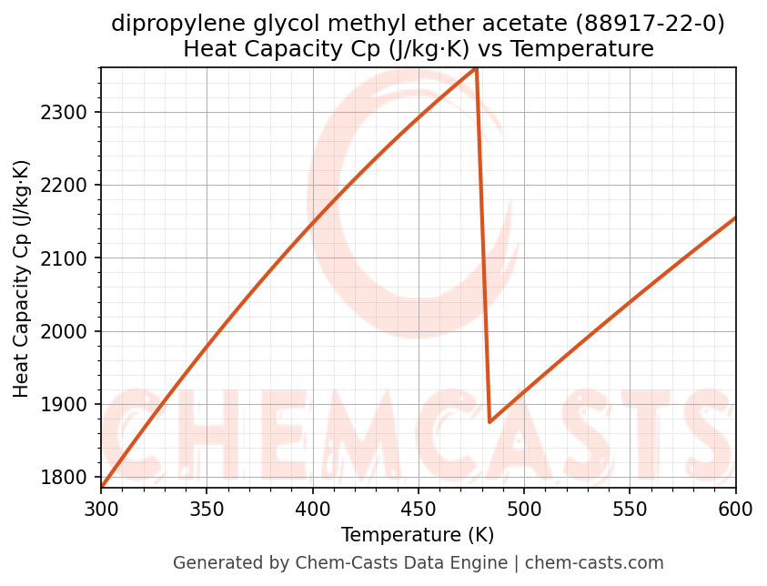 - Specific heat capacity (Cp) indicates the amount of energy required to raise the temperature of dipropylene glycol methyl ether acetate and is critical for energy balance and heat-exchanger design.