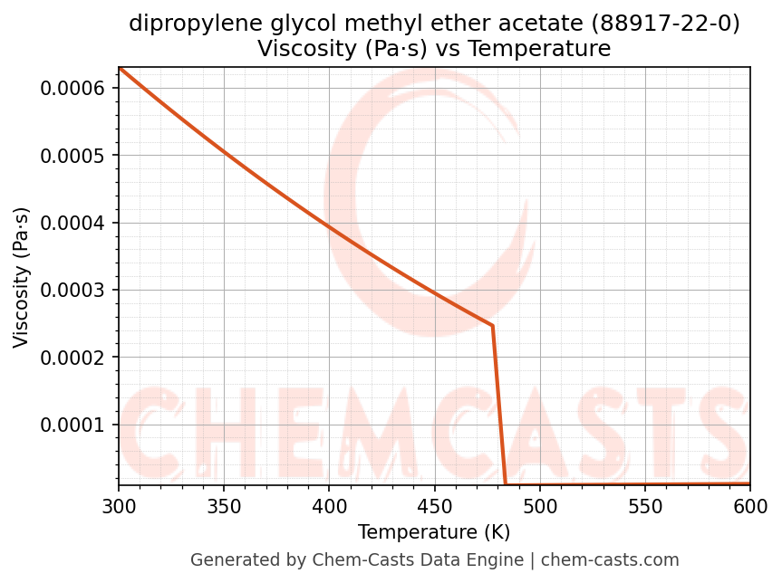 This page presents the temperature-dependent thermodynamic and transport properties of dipropylene glycol methyl ether acetate (CAS 88917-22-0) calculated at a constant pressure of 1 atm (101325 Pa) over the temperature range 250-500 K.
