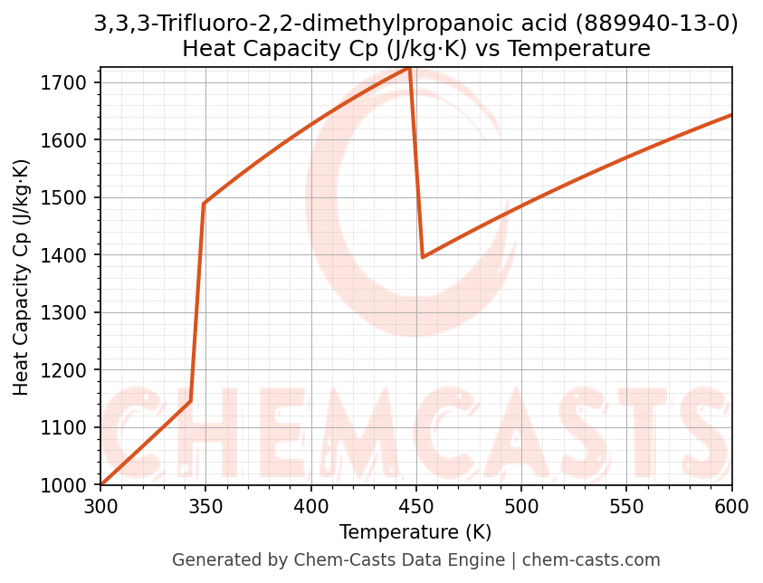 - Specific heat capacity (Cp) indicates the amount of energy required to raise the temperature of 3,3,3-Trifluoro-2,2-dimethylpropanoic acid and is critical for energy balance and heat-exchanger design.