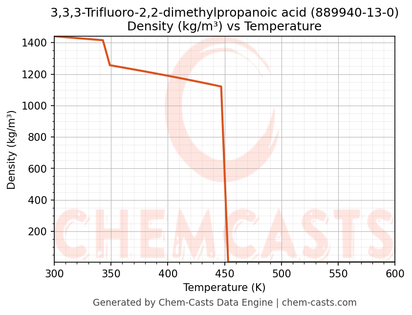 This page presents the temperature-dependent thermodynamic and transport properties of 3,3,3-Trifluoro-2,2-dimethylpropanoic acid (CAS 889940-13-0) calculated at a constant pressure of 1 atm (101325 Pa) over the temperature range 250-500 K.