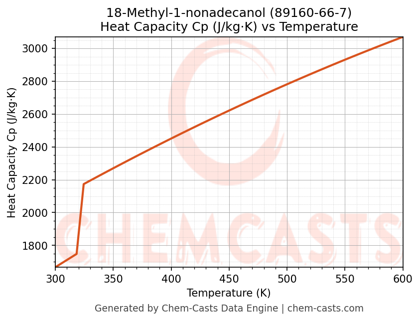 This page presents the temperature-dependent thermodynamic and transport properties of 18-Methyl-1-nonadecanol (CAS 89160-66-7) calculated at a constant pressure of 1 atm (101325 Pa) over the temperature range 250-500 K.