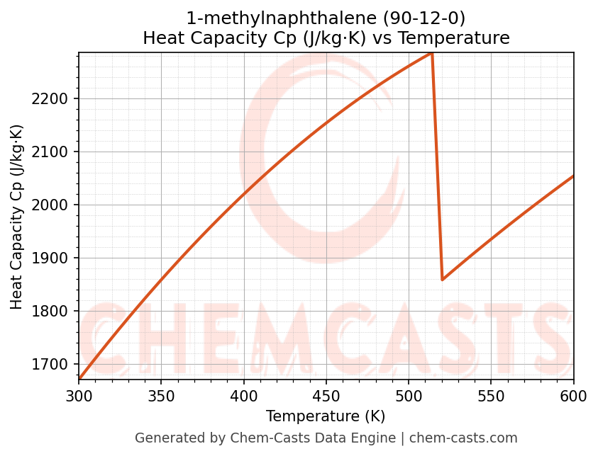 - Specific heat capacity (Cp) indicates the amount of energy required to raise the temperature of 1-methylnaphthalene and is critical for energy balance and heat-exchanger design.