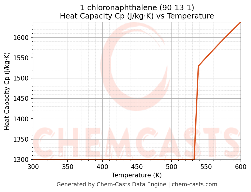 - Specific heat capacity (Cp) indicates the amount of energy required to raise the temperature of 1-chloronaphthalene and is critical for energy balance and heat-exchanger design.