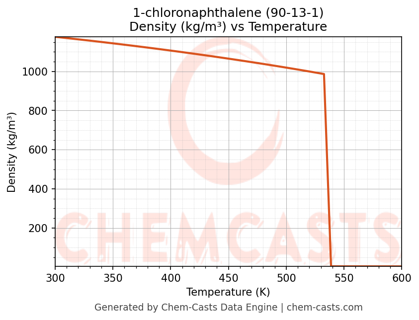 This page presents the temperature-dependent thermodynamic and transport properties of 1-chloronaphthalene (CAS 90-13-1) calculated at a constant pressure of 1 atm (101325 Pa) over the temperature range 250-500 K.