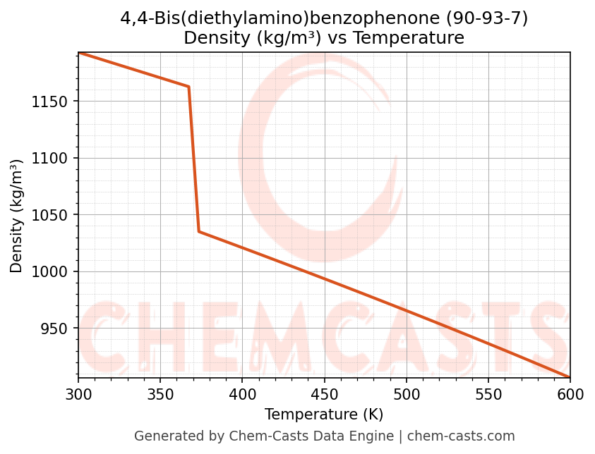 This page presents the temperature-dependent thermodynamic and transport properties of 4,4-Bis(diethylamino)benzophenone (CAS 90-93-7) calculated at a constant pressure of 1 atm (101325 Pa) over the temperature range 250-500 K.