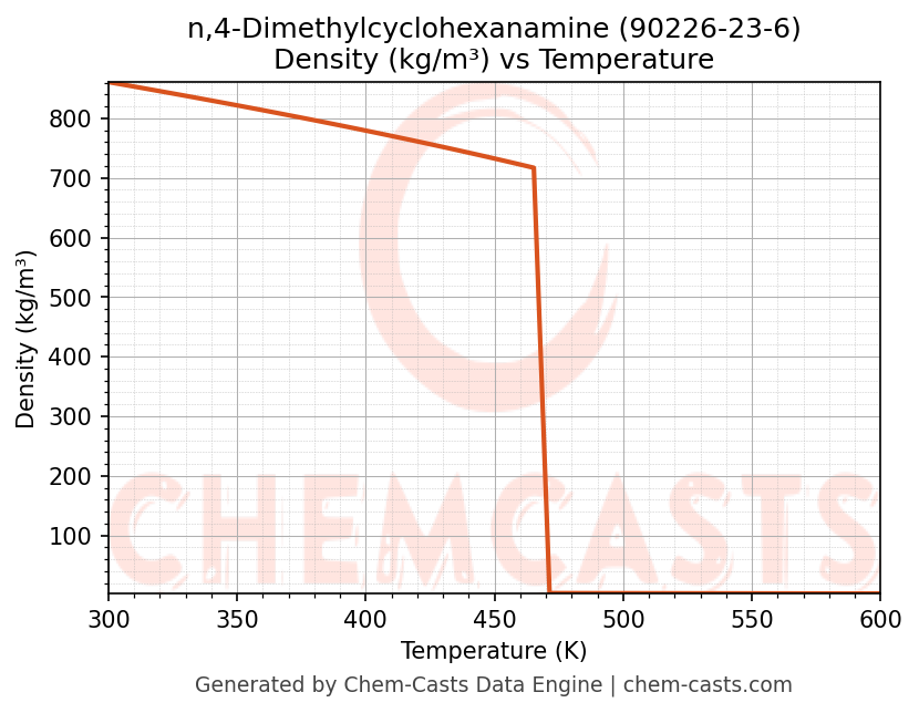 This page presents the temperature-dependent thermodynamic and transport properties of n,4-Dimethylcyclohexanamine (CAS 90226-23-6) calculated at a constant pressure of 1 atm (101325 Pa) over the temperature range 250-500 K.