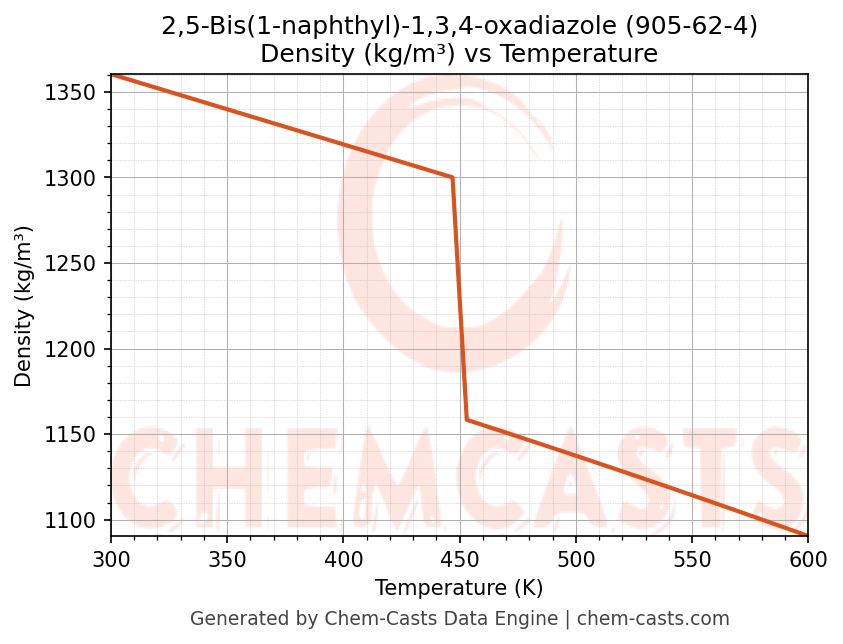 This page presents the temperature-dependent thermodynamic and transport properties of 2,5-Bis(1-naphthyl)-1,3,4-oxadiazole (CAS 905-62-4) calculated at a constant pressure of 1 atm (101325 Pa) over the temperature range 250-500 K.