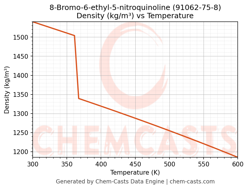 This page presents the temperature-dependent thermodynamic and transport properties of 8-Bromo-6-ethyl-5-nitroquinoline (CAS 91062-75-8) calculated at a constant pressure of 1 atm (101325 Pa) over the temperature range 250-500 K.