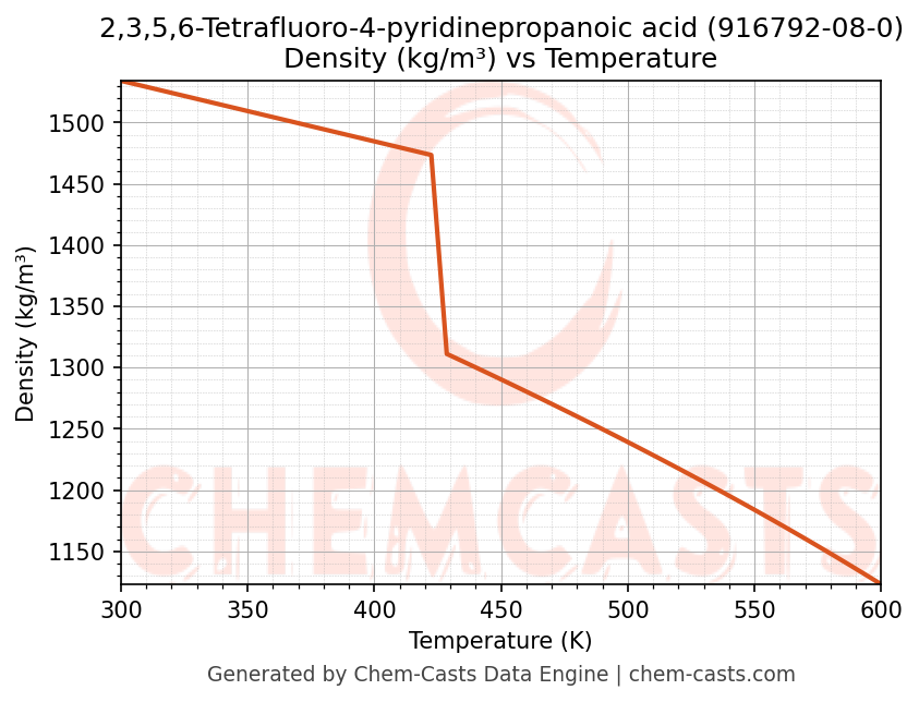 This page presents the temperature-dependent thermodynamic and transport properties of 2,3,5,6-Tetrafluoro-4-pyridinepropanoic acid (CAS 916792-08-0) calculated at a constant pressure of 1 atm (101325 Pa) over the temperature range 250-500 K.