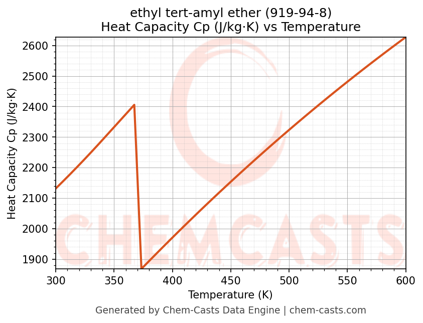 - Specific heat capacity (Cp) indicates the amount of energy required to raise the temperature of ethyl tert-amyl ether and is critical for energy balance and heat-exchanger design.
