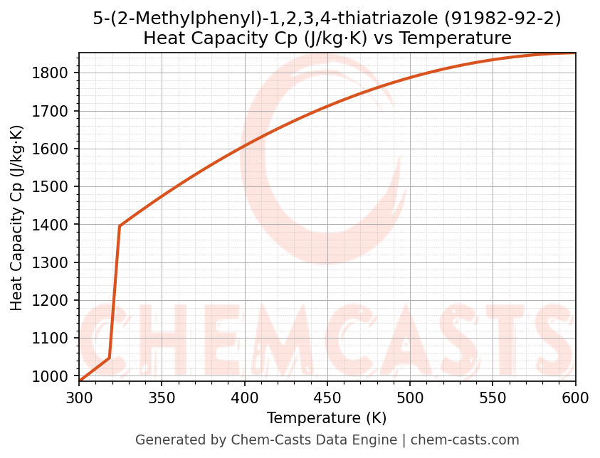 - Specific heat capacity (Cp) indicates the amount of energy required to raise the temperature of 5-(2-Methylphenyl)-1,2,3,4-thiatriazole and is critical for energy balance and heat-exchanger design.