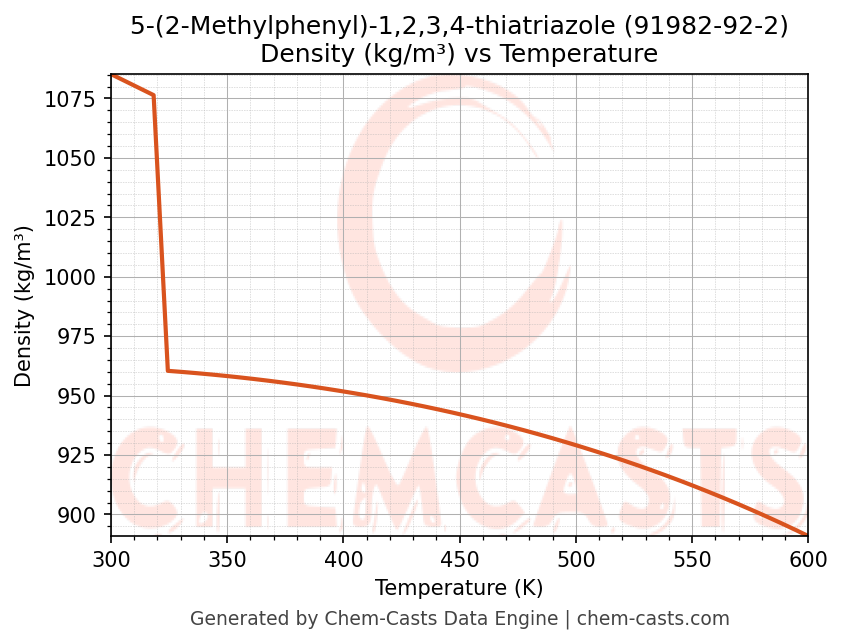 This page presents the temperature-dependent thermodynamic and transport properties of 5-(2-Methylphenyl)-1,2,3,4-thiatriazole (CAS 91982-92-2) calculated at a constant pressure of 1 atm (101325 Pa) over the temperature range 250-500 K.