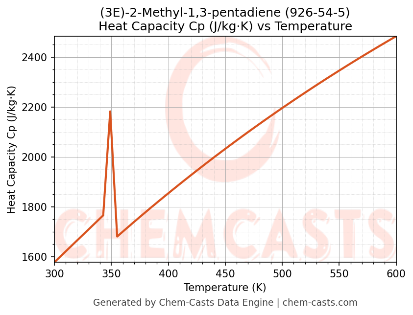 - Specific heat capacity (Cp) indicates the amount of energy required to raise the temperature of (3E)-2-Methyl-1,3-pentadiene and is critical for energy balance and heat-exchanger design.