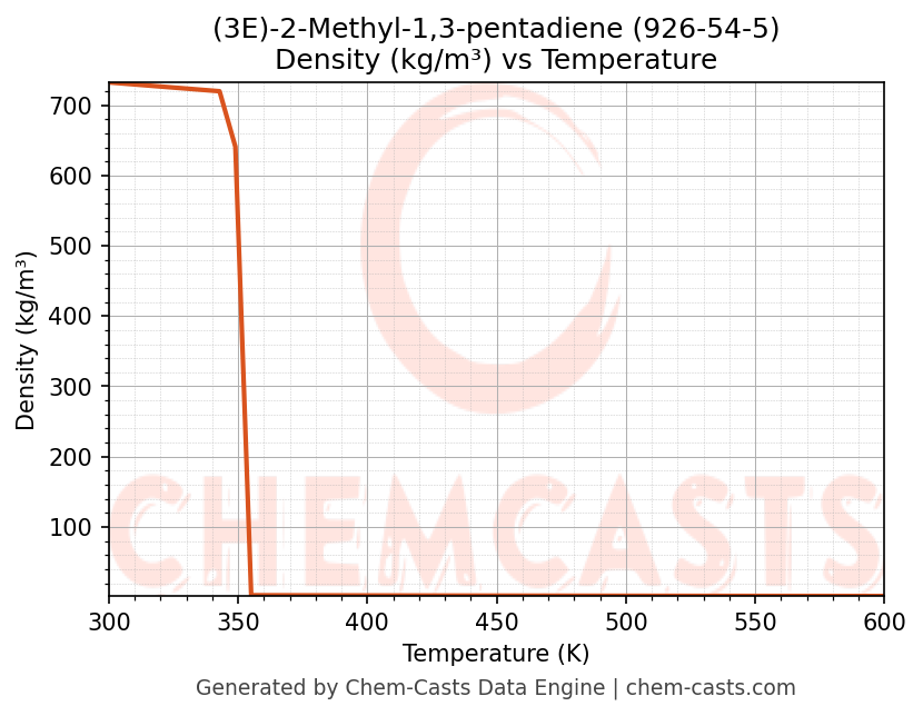 This page presents the temperature-dependent thermodynamic and transport properties of (3E)-2-Methyl-1,3-pentadiene (CAS 926-54-5) calculated at a constant pressure of 1 atm (101325 Pa) over the temperature range 250-500 K.