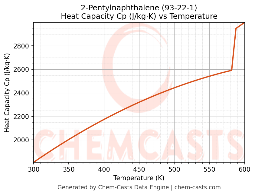 - Specific heat capacity (Cp) indicates the amount of energy required to raise the temperature of 2-Pentylnaphthalene and is critical for energy balance and heat-exchanger design.