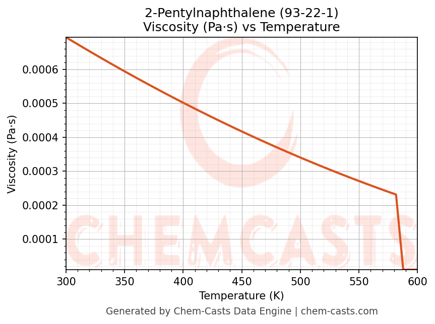 This page presents the temperature-dependent thermodynamic and transport properties of 2-Pentylnaphthalene (CAS 93-22-1) calculated at a constant pressure of 1 atm (101325 Pa) over the temperature range 250-500 K.