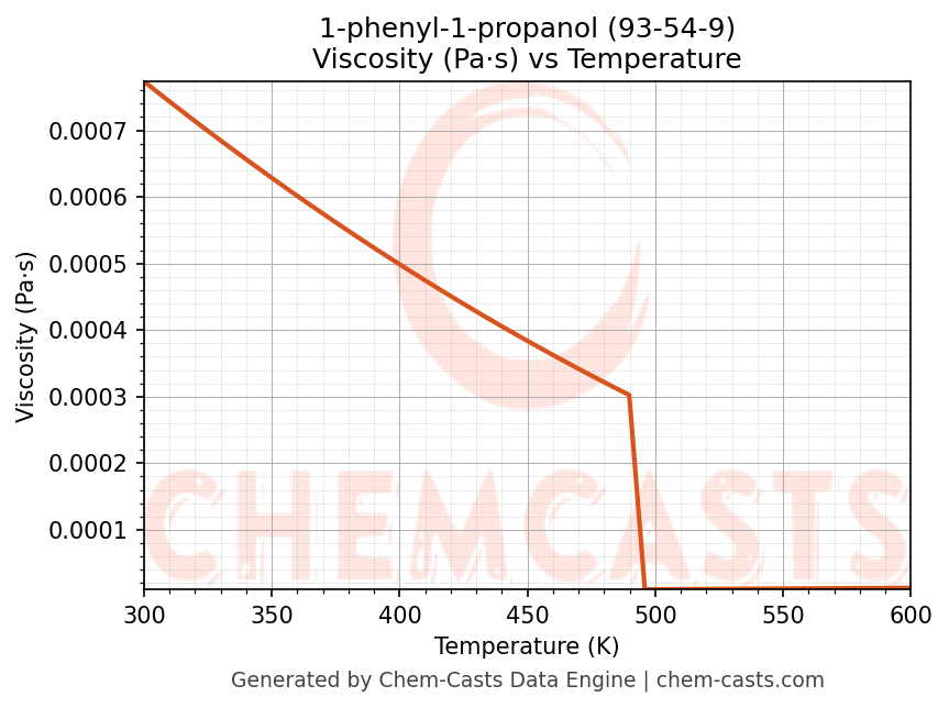 This page presents the temperature-dependent thermodynamic and transport properties of 1-phenyl-1-propanol (CAS 93-54-9) calculated at a constant pressure of 1 atm (101325 Pa) over the temperature range 250-500 K.