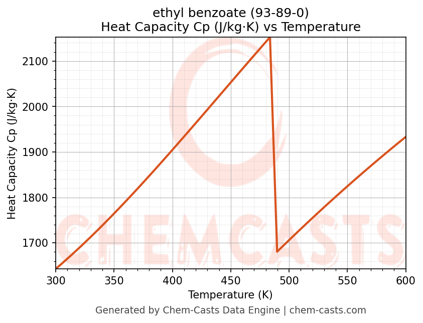 - Specific heat capacity (Cp) indicates the amount of energy required to raise the temperature of ethyl benzoate and is critical for energy balance and heat-exchanger design.