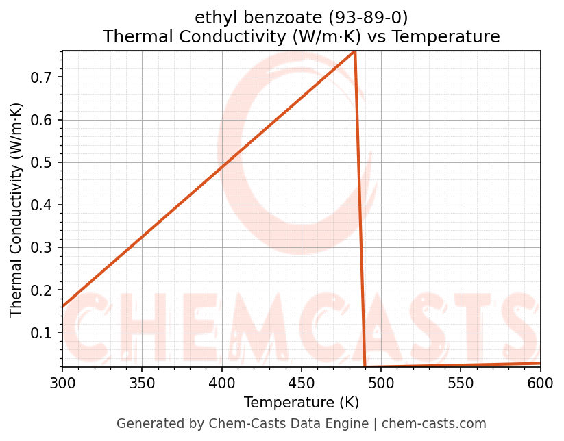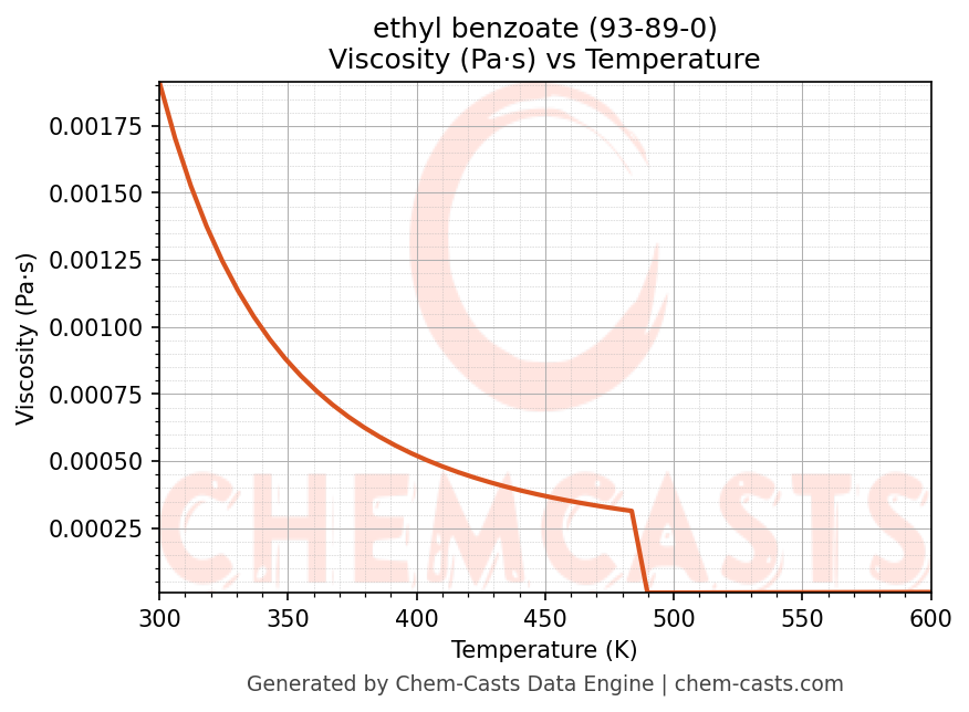 This page presents the temperature-dependent thermodynamic and transport properties of ethyl benzoate (CAS 93-89-0) calculated at a constant pressure of 1 atm (101325 Pa) over the temperature range 250-500 K.