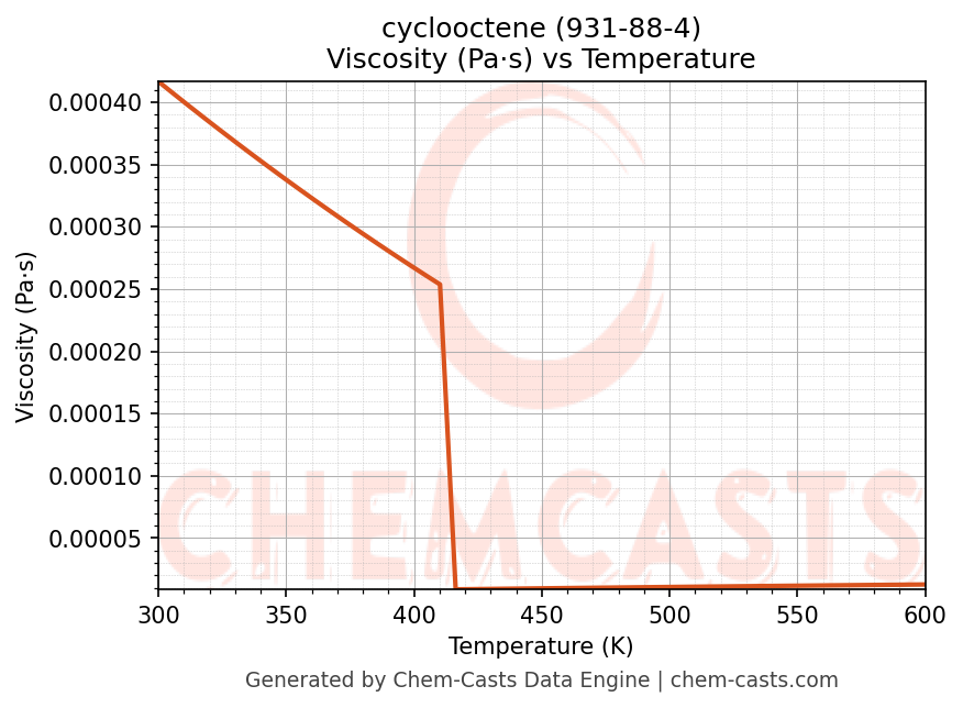 This page presents the temperature-dependent thermodynamic and transport properties of cyclooctene (CAS 931-88-4) calculated at a constant pressure of 1 atm (101325 Pa) over the temperature range 250-500 K.